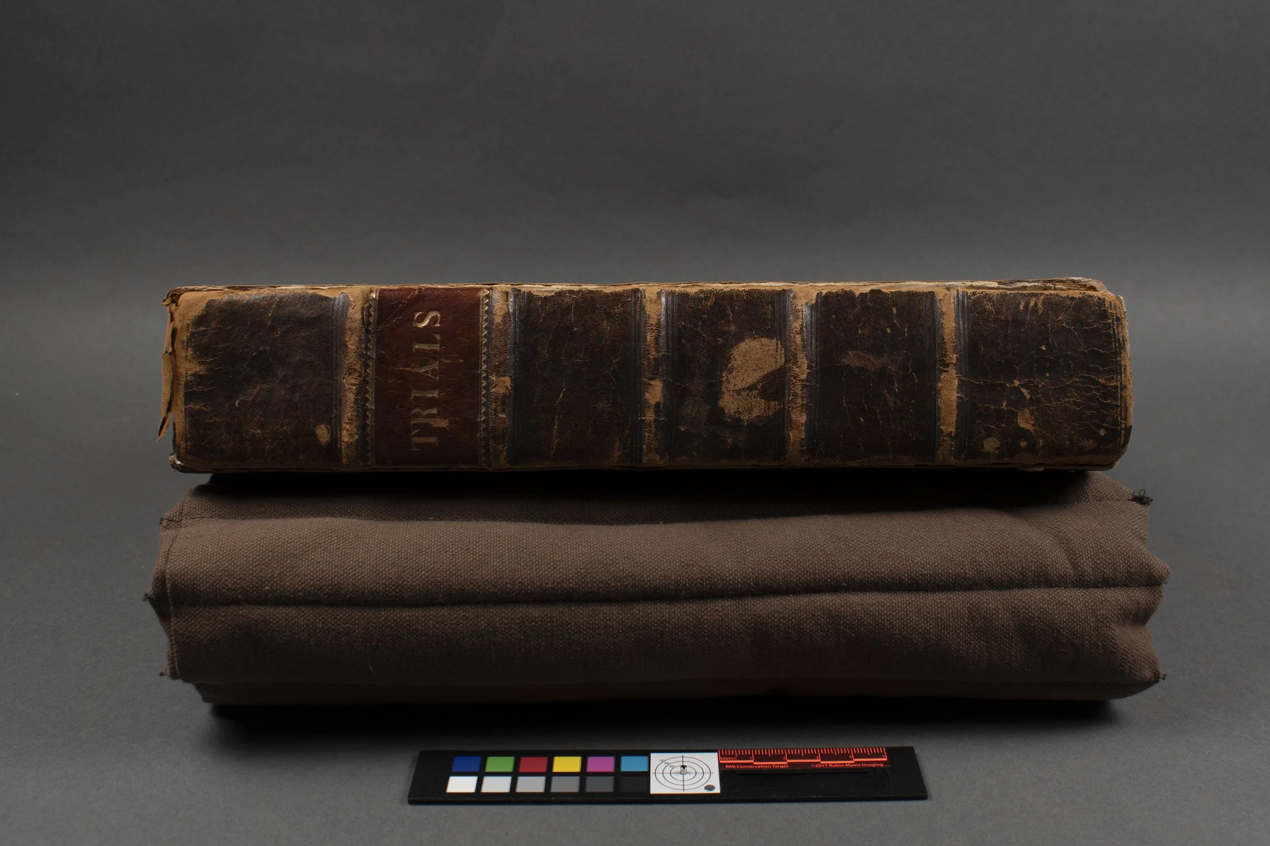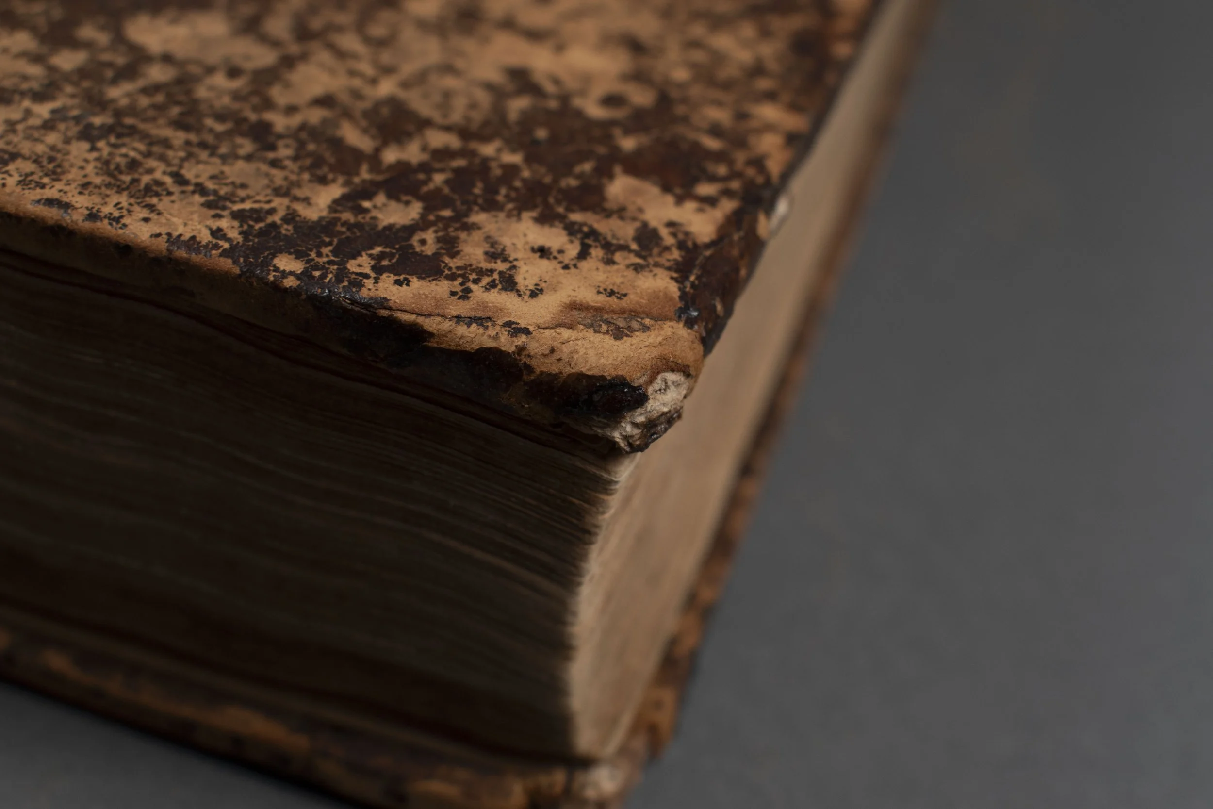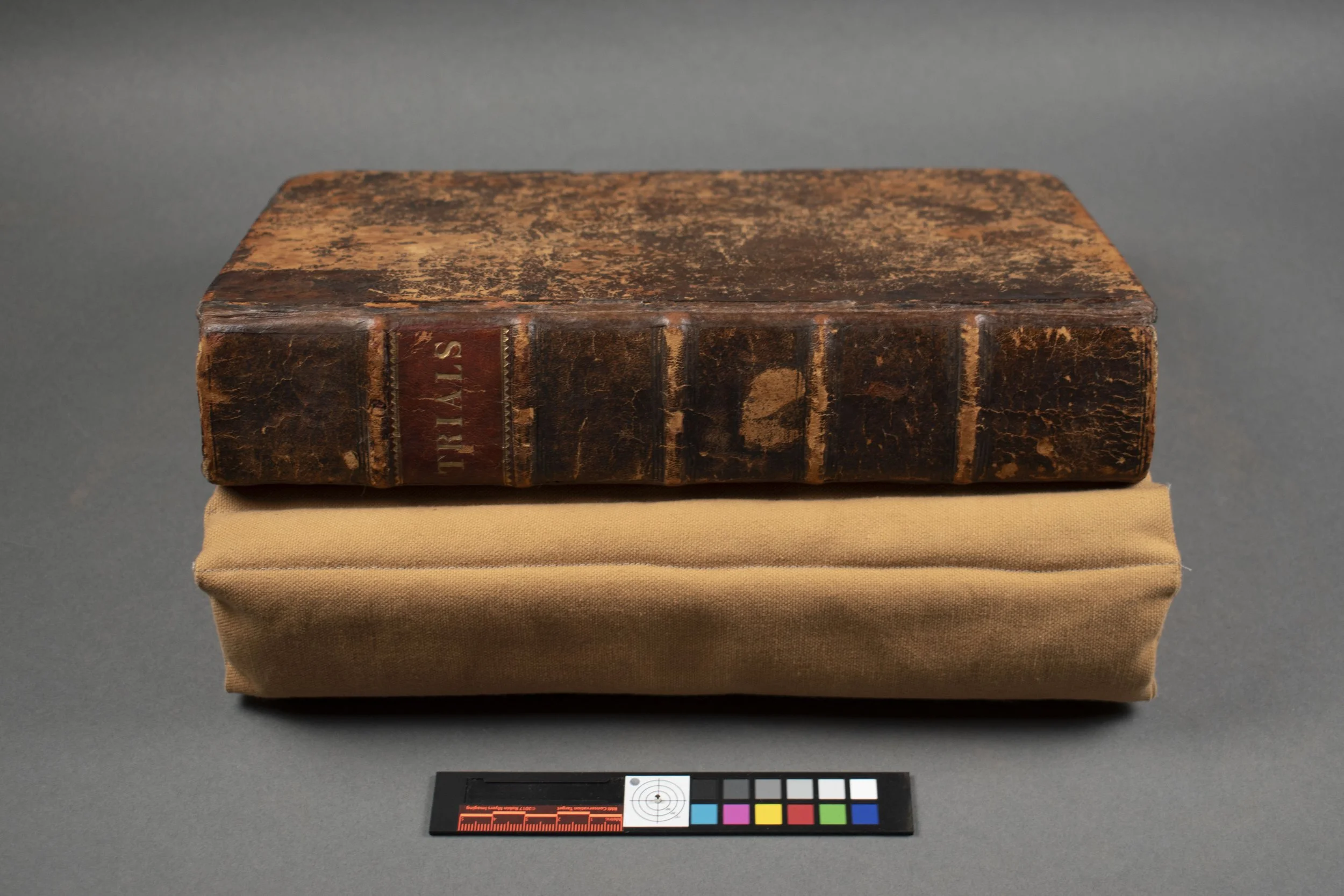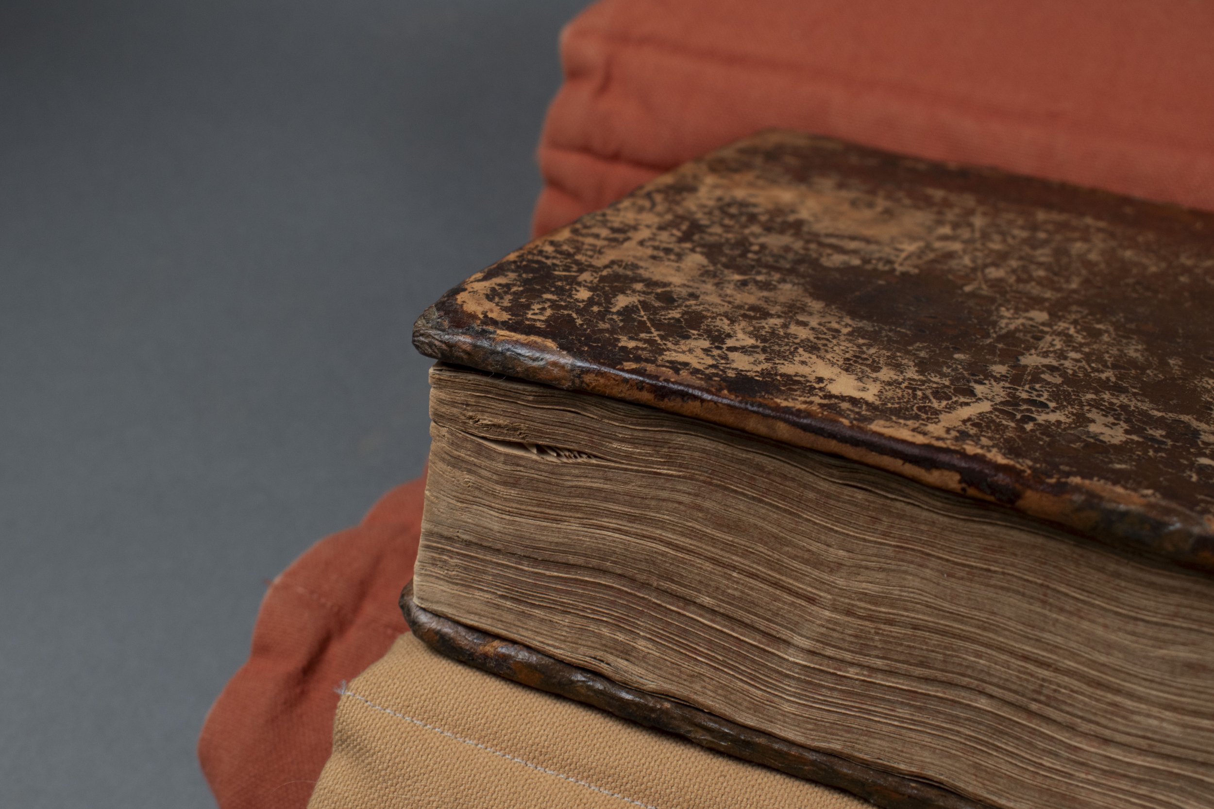 Flaking / desiccated leather consolidated with Klucel-G and methylcellulose, japanese tissue applied to bare board edges.